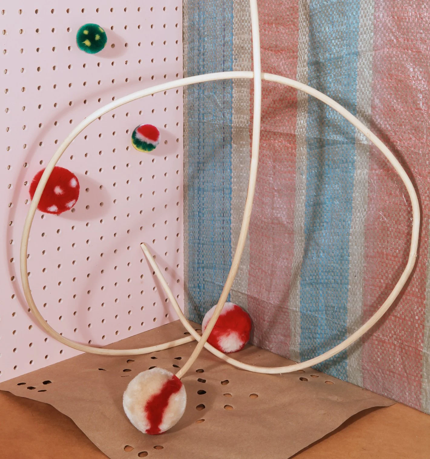 Bass, echoes and reverb vibrate across the first floor bedroom of Van Gogh House, interspersed with the sounds of Chinese tribal mountain songs and a sampling of mid 1960’s rocksteady beats. Li’s sound system is situated next to flowing locks of faux hair, often adorned by partygoers, tied to loops of twisting and turning cane. They are juxtaposed by Chinese opera pom poms, net curtains and anchored to leaf patterned concrete bricks. On the ground floor, a dub siren is attached to a 1960’s gossip bench as an interactive object for visitors to play. This is set against a playlist of dub music coming out of another sound system sat on a burgundy carpeted staircase.